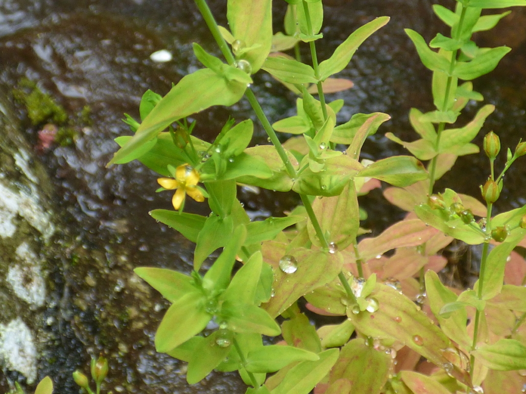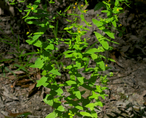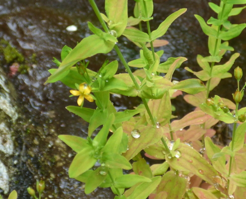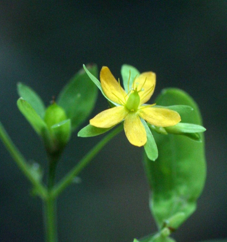 The April Mystery Plant is a perennial herb found along lake and river shores and in wet meadows. It has opposite, simple and entire (untoothed), elliptical (oval) leaves. The yellow flowers are 1/8” – 1/3” wide, are borne singly on elongated pedicels, and have 5 separate petals and sepals and 5-12 stamens per flower. The fruit capsule is 2-3.5 mm in length.