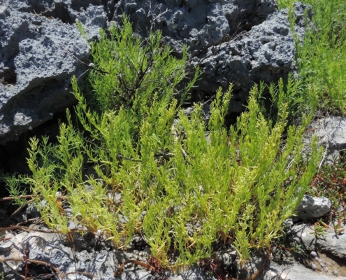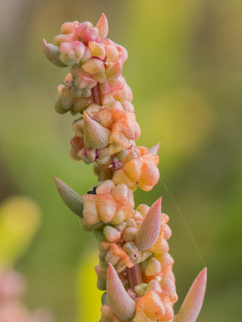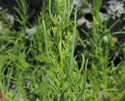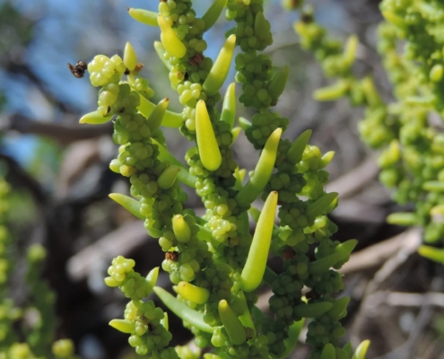 Those exploring Rhode Island’s salt marshes and beaches in late summer and fall will find this herbaceous annual growing 1-3 feet tall along the edge of the high marsh and dunes. Each fleshy deep green leaf is narrow, flat on the upper surface and rounded on the lower surface and alternates along crowded ascending stems. Small greenish flowers with indistinguishable parts are found in the leaf axils.