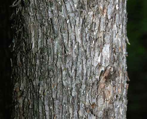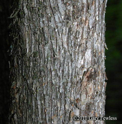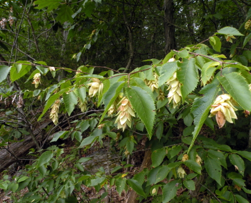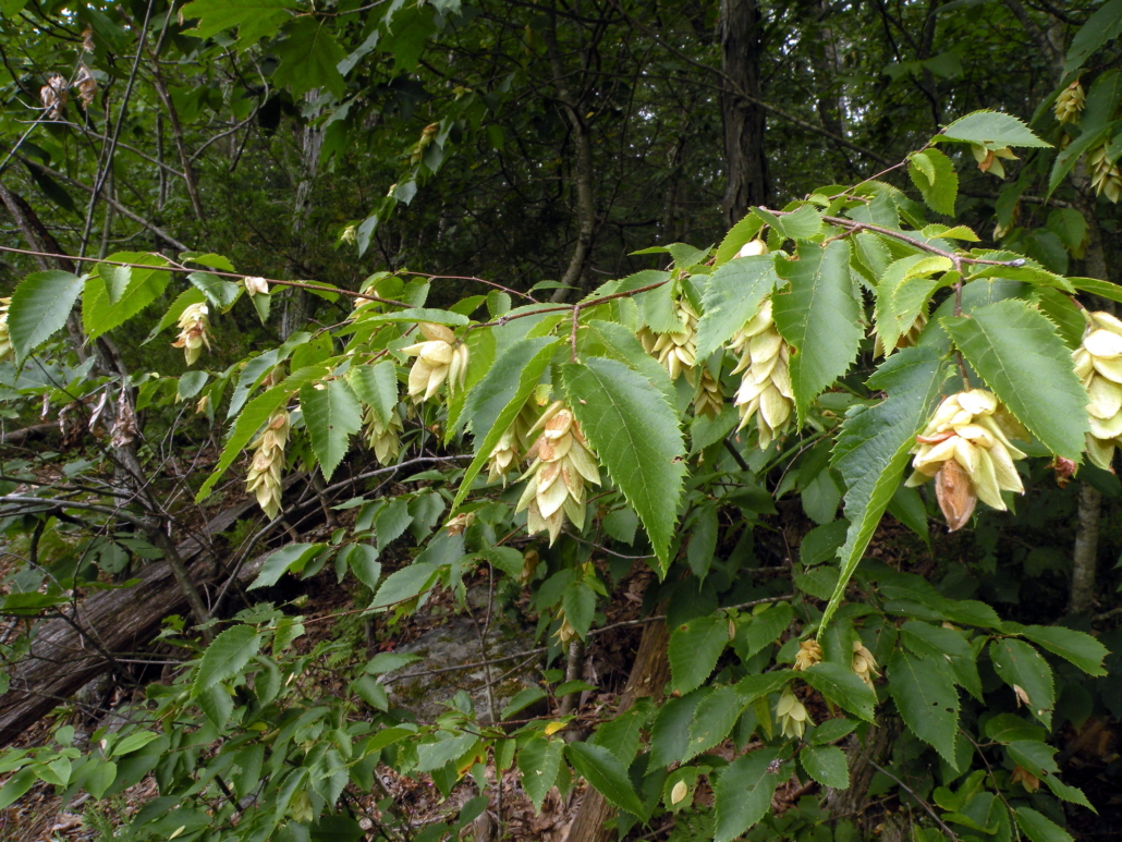 This small native tree has a distinctive finely shreddy light-gray bark. The leaves are double-toothed, alternate and simple. The fruit are distinctive in sporting inflated sacs surrounding a small dark brown seed. Found in rich moist woods.