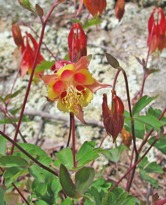 This is an early spring-blooming wildflower found on rocky slopes and ledges. It grows one to two feet tall and has showy nodding flowers with five red petals. Each petal ends in a long spur. The leaves are alternate and compound with deeply lobed leaflets.