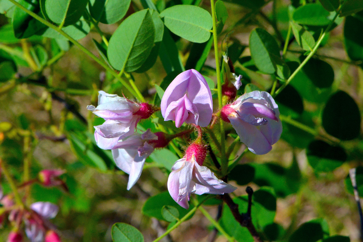 The mystery plant for October is a shrub with alternate, compound leaves and rose or pink-purple colored flowers. It grows to a height of 3 to 6 feet tall. It has large clusters (racemes) of pea-shaped flowers. The sepals are often covered with glandular hairs while the stems are thickly beset with bristly hairs. These shrubs produce pods with seeds, but the seed is seldom fertile. This shrub blooms from late May through the month of June.