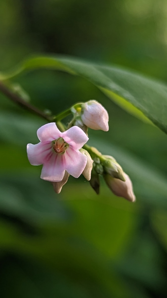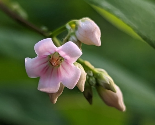 Our Mystery Plant this month is a 2 to 3 foot tall bushy perennial with opposite, oval leaves. Numerous small pink nodding flowers emerge from the tip of the stem starting in late July and are mildly fragrant. The bell-like flowers are striped inside with deeper pink. Milky juice exudes from broken stems and leaves.