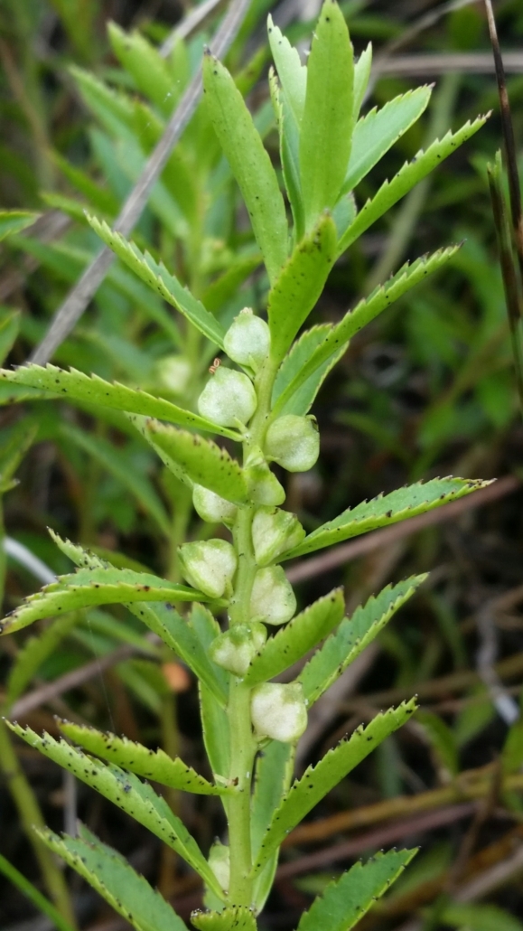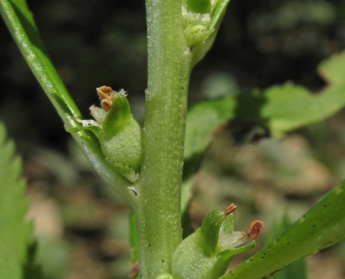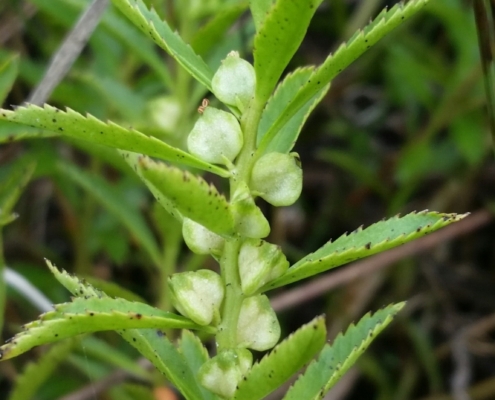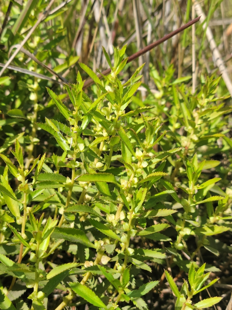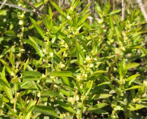 This common wetland emergent herbaceous species has small 3-parted green flowers that bloom in summer in the axils of alternating leaves. The leaves range from sharply toothed above- to comb-like leaves underwater. Plants range from 6” -12” in height. Usually found in muddy shorelines, such as at Blue Pond in Hopkinton.