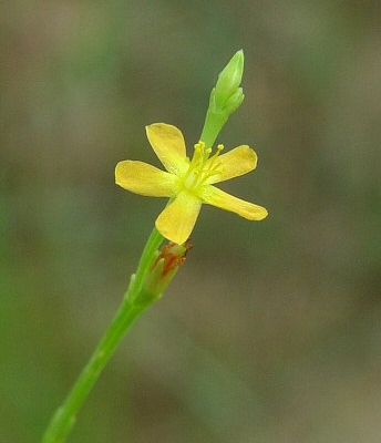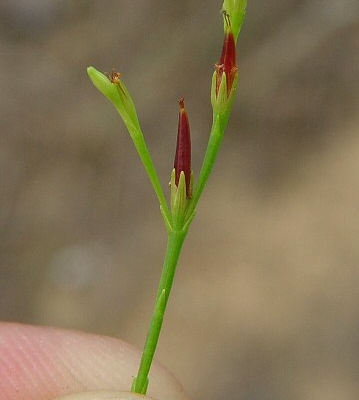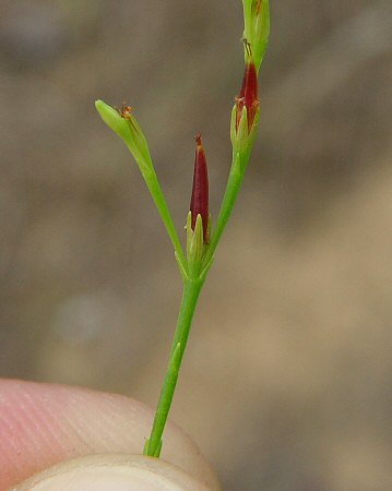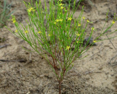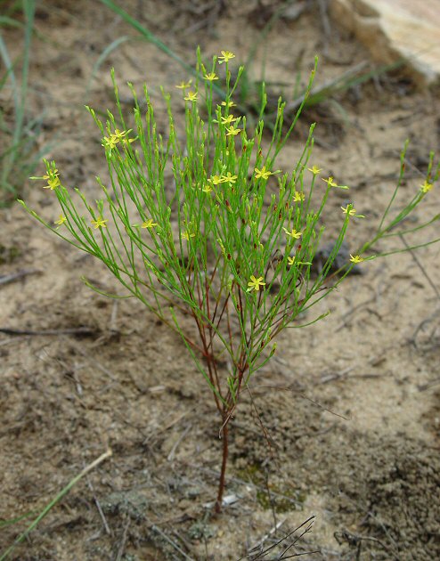 This diminutive annual is found growing summer and fall on sunny and barren soils. The plant is very unassuming but easily identified by its wiry stems, tiny yellow flowers and citrus-like scent when crushed. The flowers have 5 regular petals and appear at the end of the branches that are only 3 to 10 inches high. The tiny scale-like leaves are opposite but most people would think there are no leaves at all. The fruit are red conical capsules distinctive of this plant’s family. If you see it next summer be sure to crush and smell the stems!