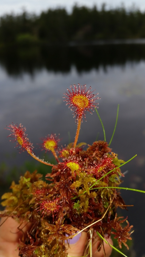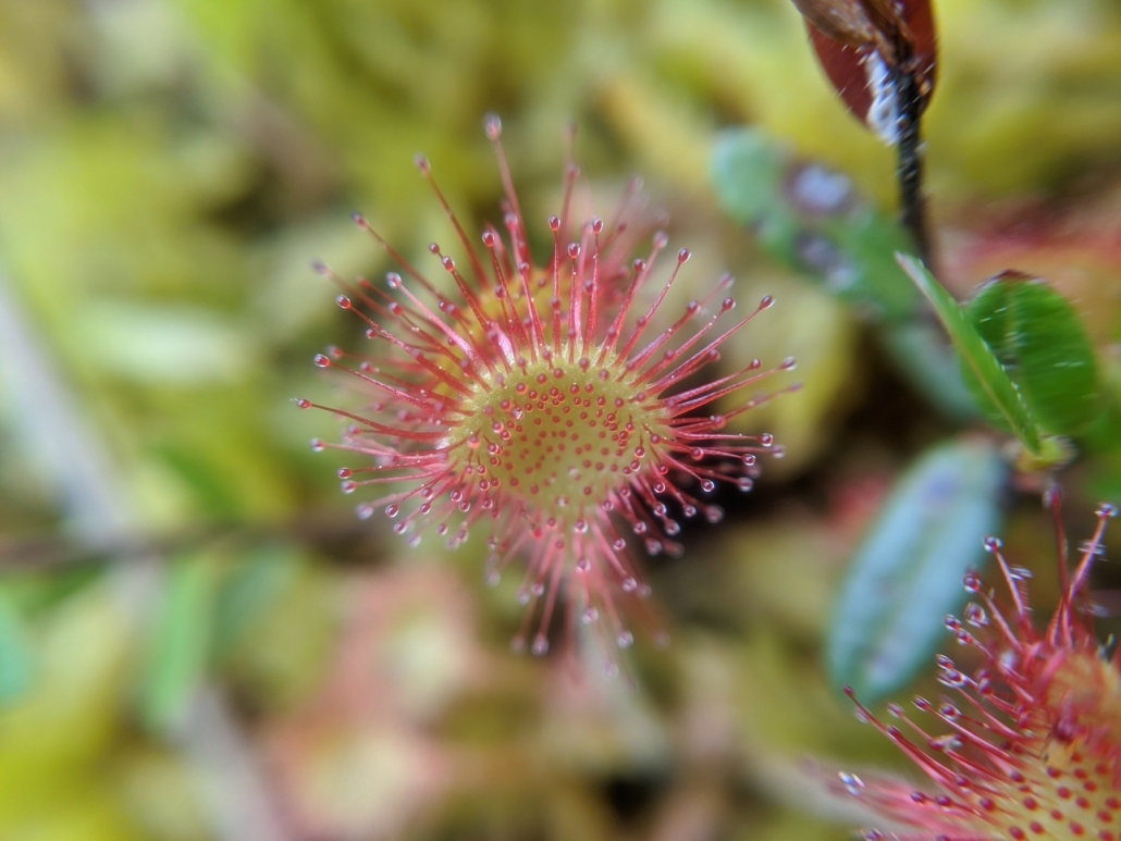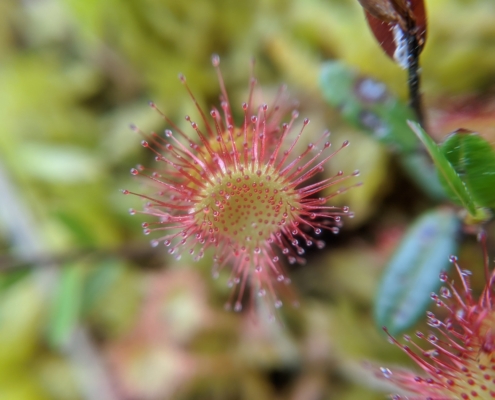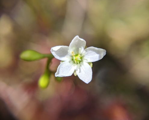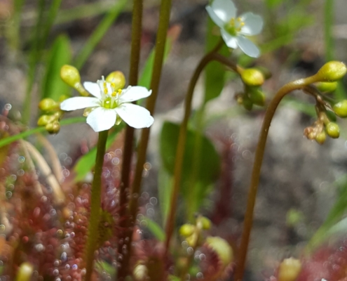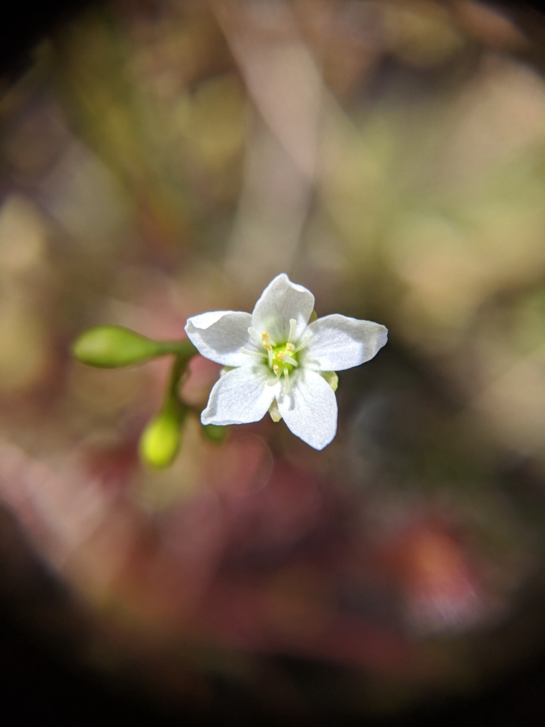 Welcome to 2024! Our January Mystery Plant is a tiny denizen of bogs, fens and wetland margins. Its tiny basal leaves are as wide as long with pubescent petioles. The reddish leaves are covered with sticky glandular hairs that trap and digest insects. The regular flowers are arranged in a one-sided raceme and each flower has 5 white petals. This species is differentiated from its more common cousin by the shape of the leaf.
