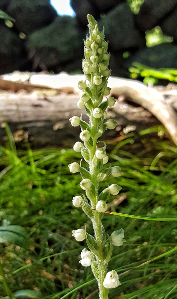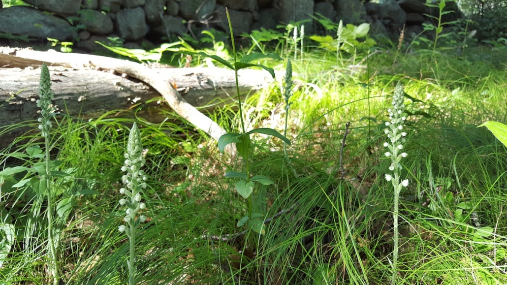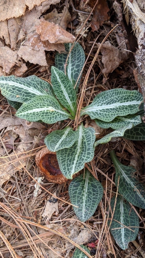 Our July Mystery Plant is a common woodland herb you have likely encountered in your Rhode Island rambles. It’s foliage is basal, evergreen and distinctively checked with white veins. A leafless wooly stalk ends in a spike of white flowers developing in early summer. The individual flowers are irregular and more or less two-lipped.