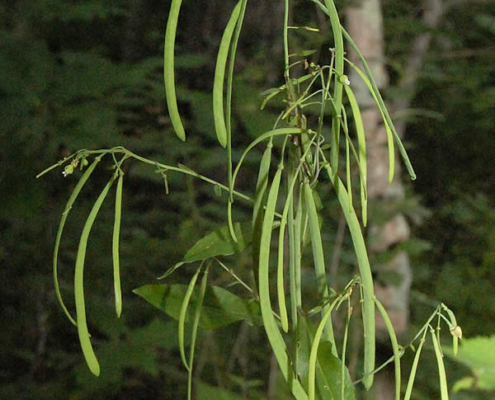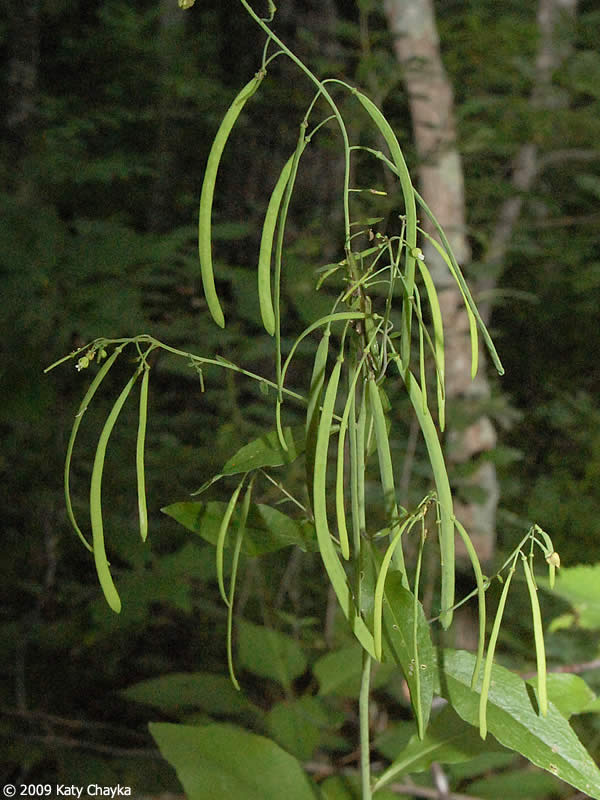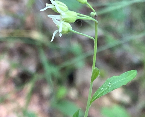 The mystery plant for March 2022 is a summer blooming native perennial that Doug McGrady showed me last July in northern RI. It’s 4-petalled white flowers yield deeply curved drooping pods. The alternating leaves are toothed, downy and narrow at the base. The plant grows 1-3 feet tall in rocky woods.