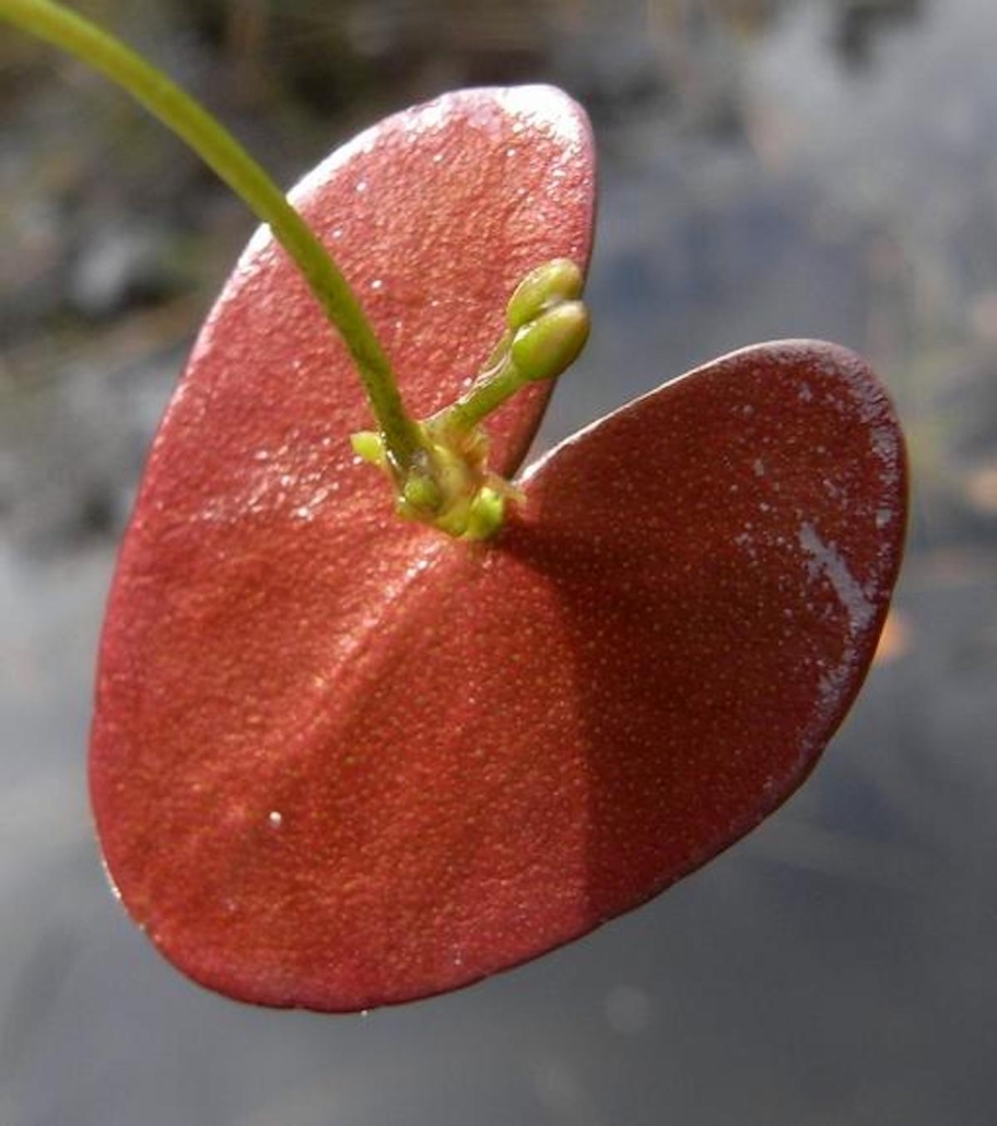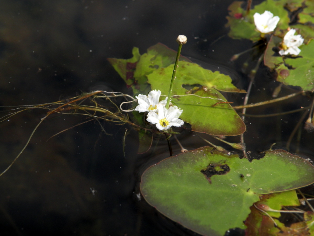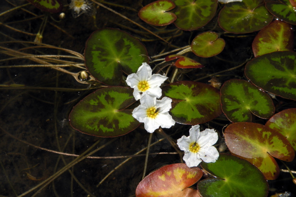 Our lovely March Mystery Plant is a floating aquatic herb with small heart-shaped leaves attached to long stems. The leaves are green-red variegated on top and reddish-purple below. Several individual 5-parted white flowers are produced in summer and early fall from a cluster of small tubers floating near the surface. The flowers stand a few inches above the water surface – an aquatic meadow of sorts?
