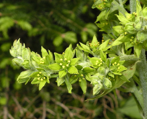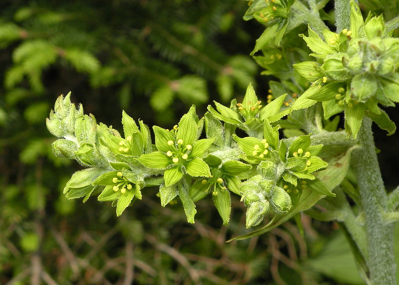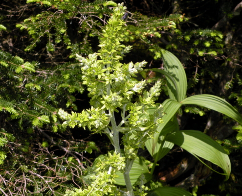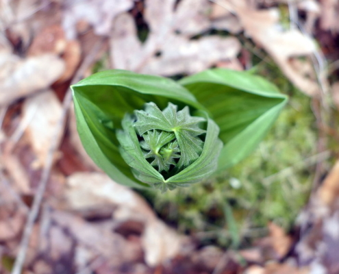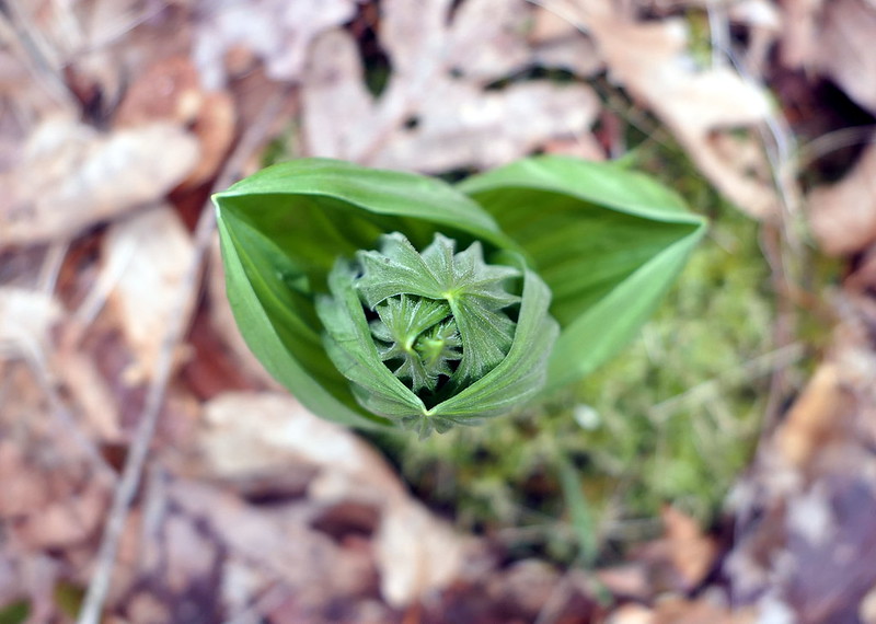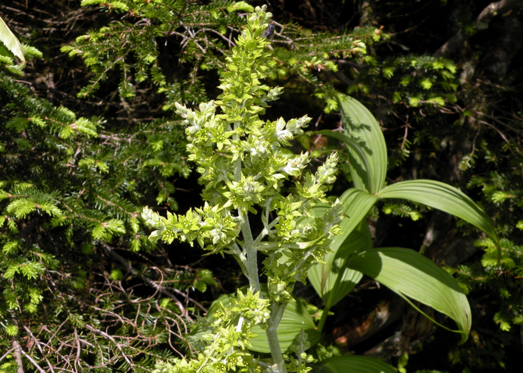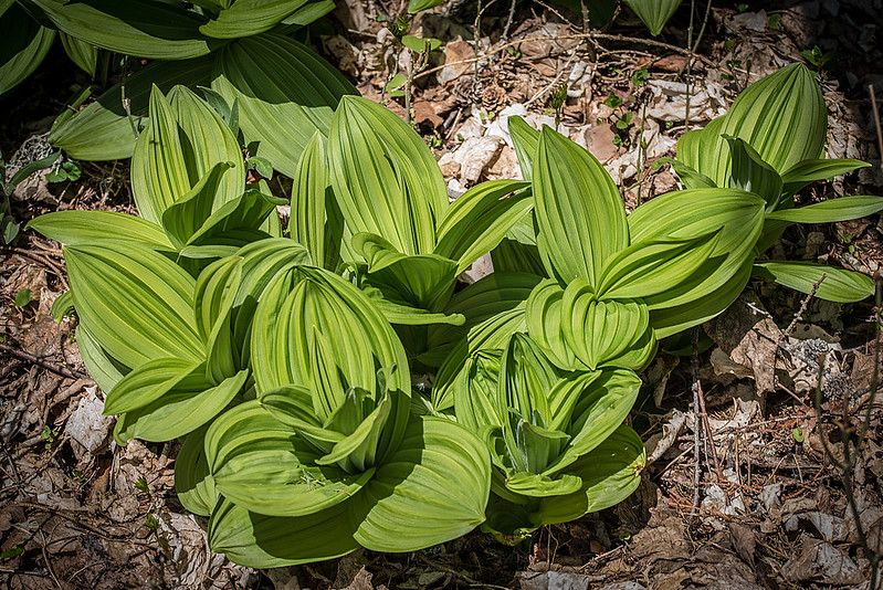 The March Mystery Plant is a perennial herb that grows 2 to 6 feet tall in wooded swamps and along shaded streams. The large clusters of yellow-green flowers have 6 regular parts in late spring or early summer. The large, alternating, strongly-ribbed oval leaves clasp the stem.