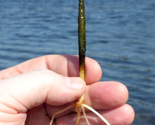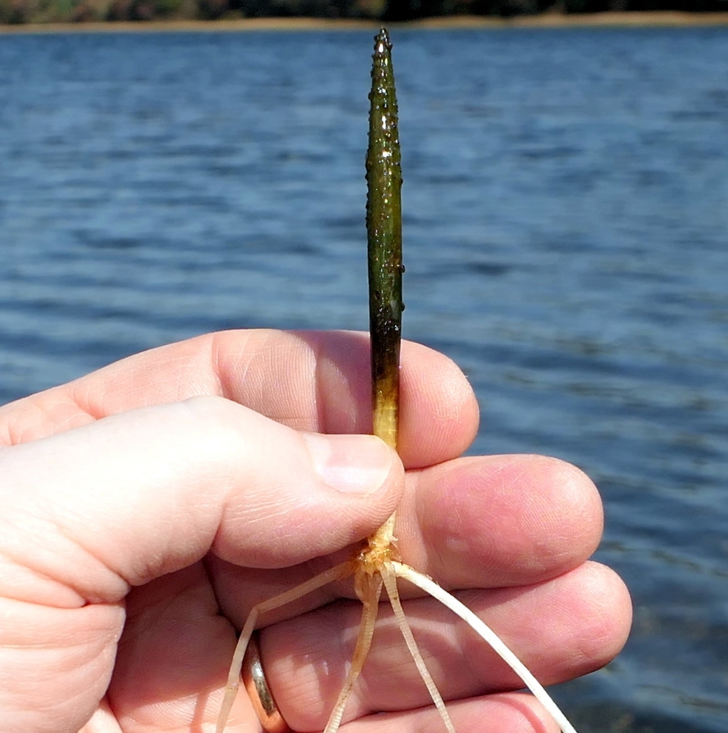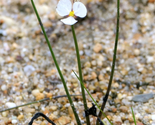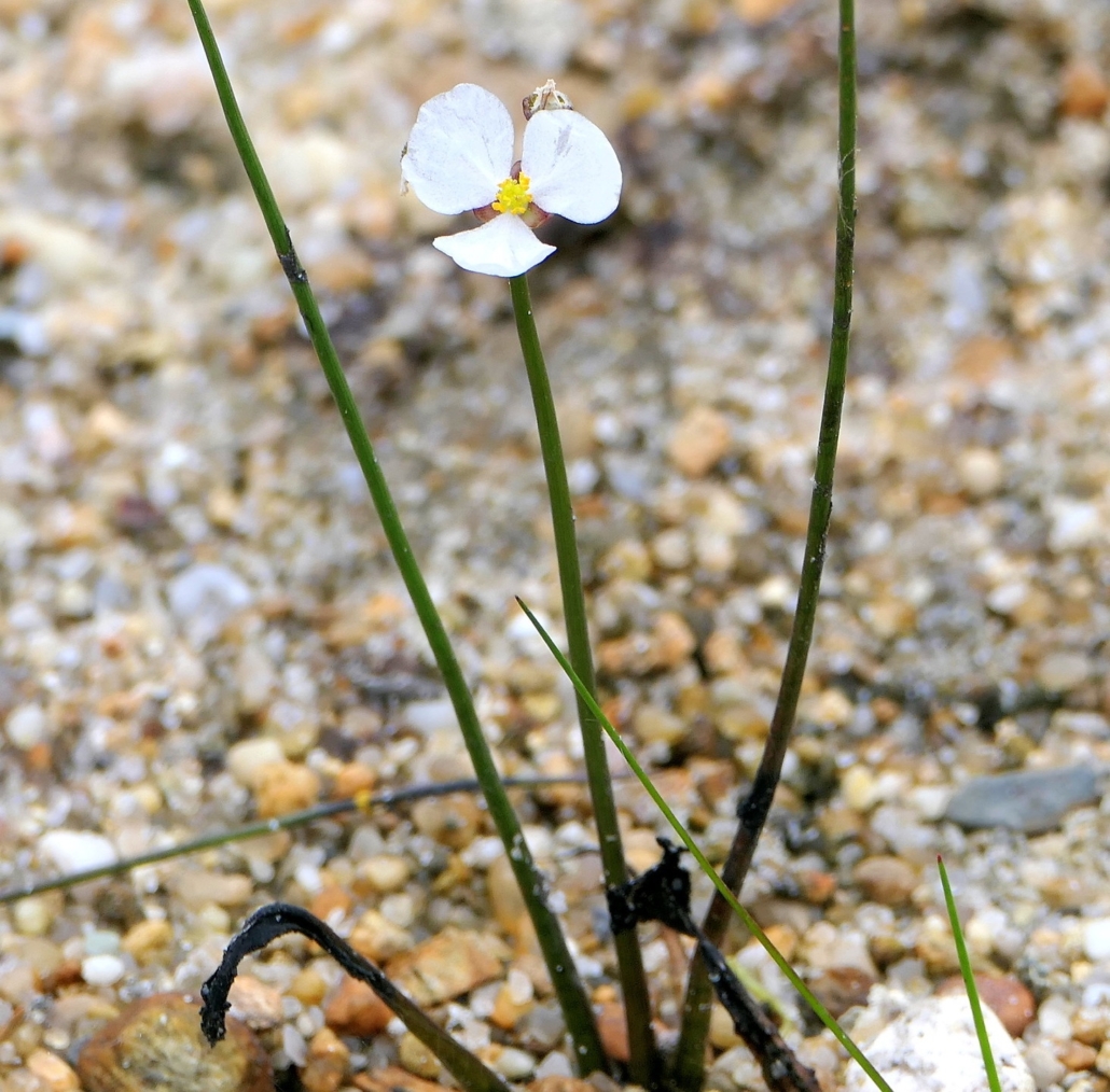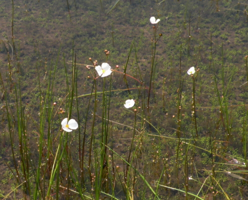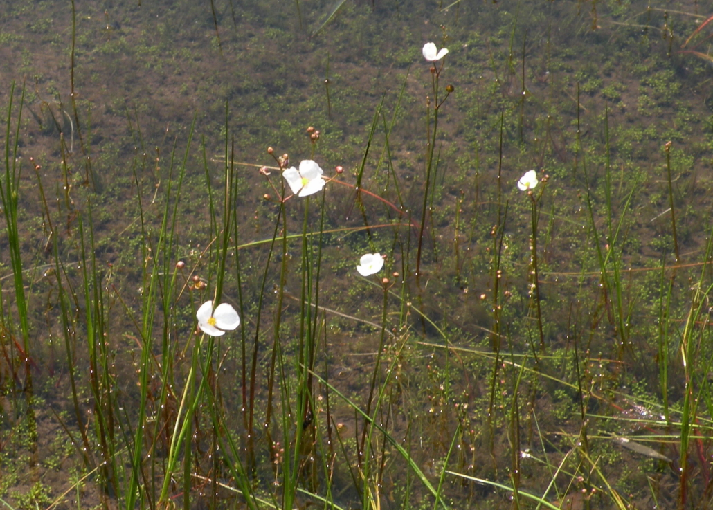 This rare aquatic differs from other in its genus by having cylindrical leaves that taper to a point. The ½” wide 3-petalled white flowers are found in summer on a stalk far above the basal leaves emerging from shallow water. Found in our freshwater coastal ponds.