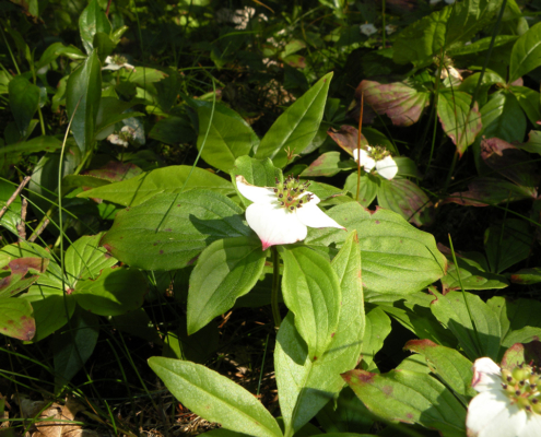 Our May Mystery plant is a woody sub-shrub that is more common in northern New England where summers are cooler, but it has been reported in Providence and Kent counties. It is considered rare in Rhode Island and is a species of concern. It has a whorl of ovate pointed leaves and in May an umbel of tiny greenish-yellow flowers surrounded by four white bracts. It grows 4” to 9” tall. The small red berry-like drupes ripen in a cluster during late August and give this plant one of its’ colloquial names.