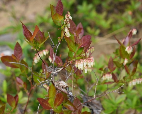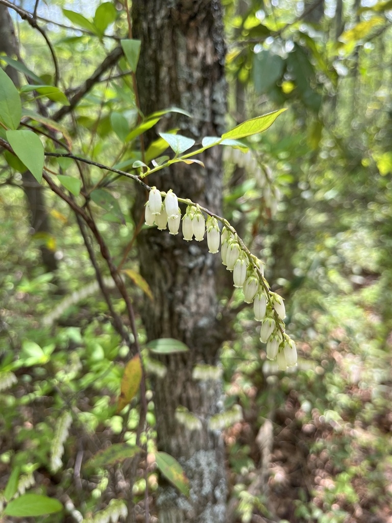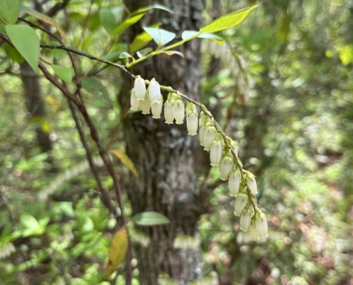 Our May Mystery Plant is a deciduous suckering shrub of damp woodland soils found along stream banks, ponds and swamps. Grows 3-8′ tall bearing narrow racemes of fragrant, bell-shaped, white flowers blooming in May to June. The flowers are followed by 5-parted light brown capsules. The alternating leaves are pointed, oblong to elliptic, glossy green leaves with finely toothed margins.
