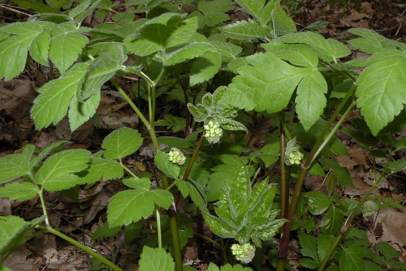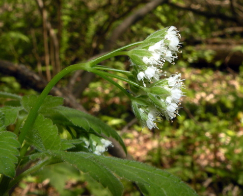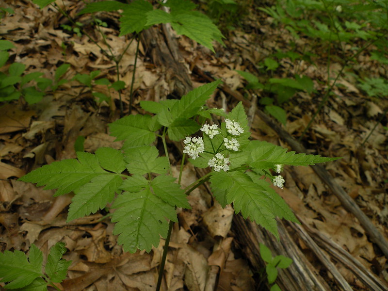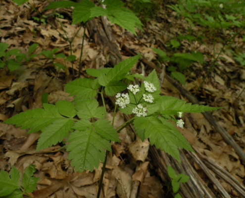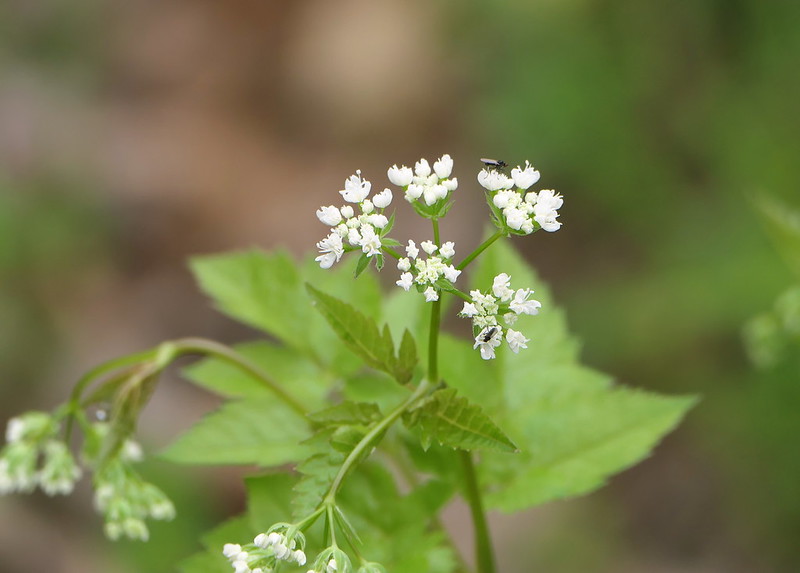 This month’s Mystery Plant belongs to a common family that is an important source of pollen for bees and also the family of a common vegetable that is also a naturalized weed. This particular species is found in woodlands. This is a good month to pull out Newcomb’s Wildflower Guide and use these basic clues to narrow your search: flowers tiny and white with 5 regular parts, arranged in an umbel. Leaves fern-like, 2- to 3-times divided, but not finely divided. Now take a close look at Doug McGrady’s excellent photos of the flowers before finalizing your guess. Good luck!