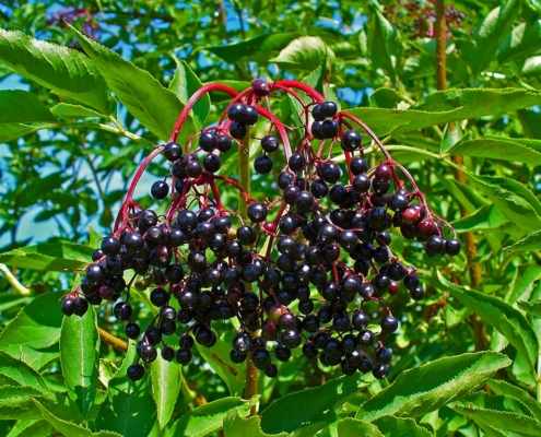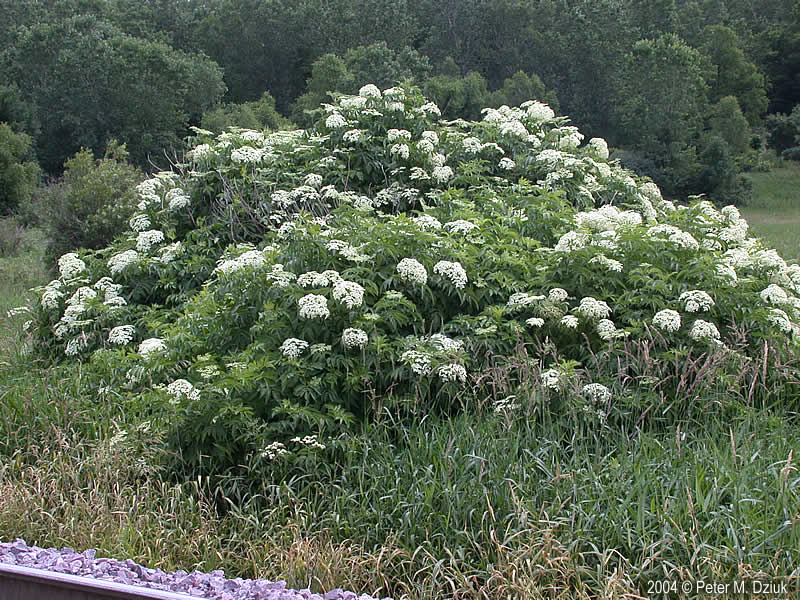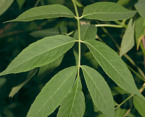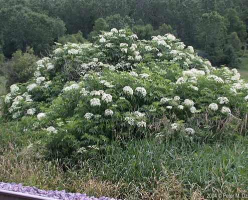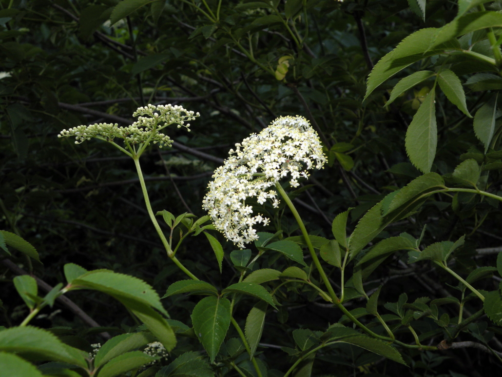 The September Mystery Plant is a large native shrub with opposite compound leaves and dome-shaped clusters of white flowers 3-10″ across at the tips of current season growth. Each 5-parted flower is only 1/4″ across, followed by a purplish-black berry that is great in pie or fermenting to a wine (however the raw berries are toxic!). This plant is common in roadside ditches and moist meadows or woodland edges – and is easiest to identify in bloom or in fruit.